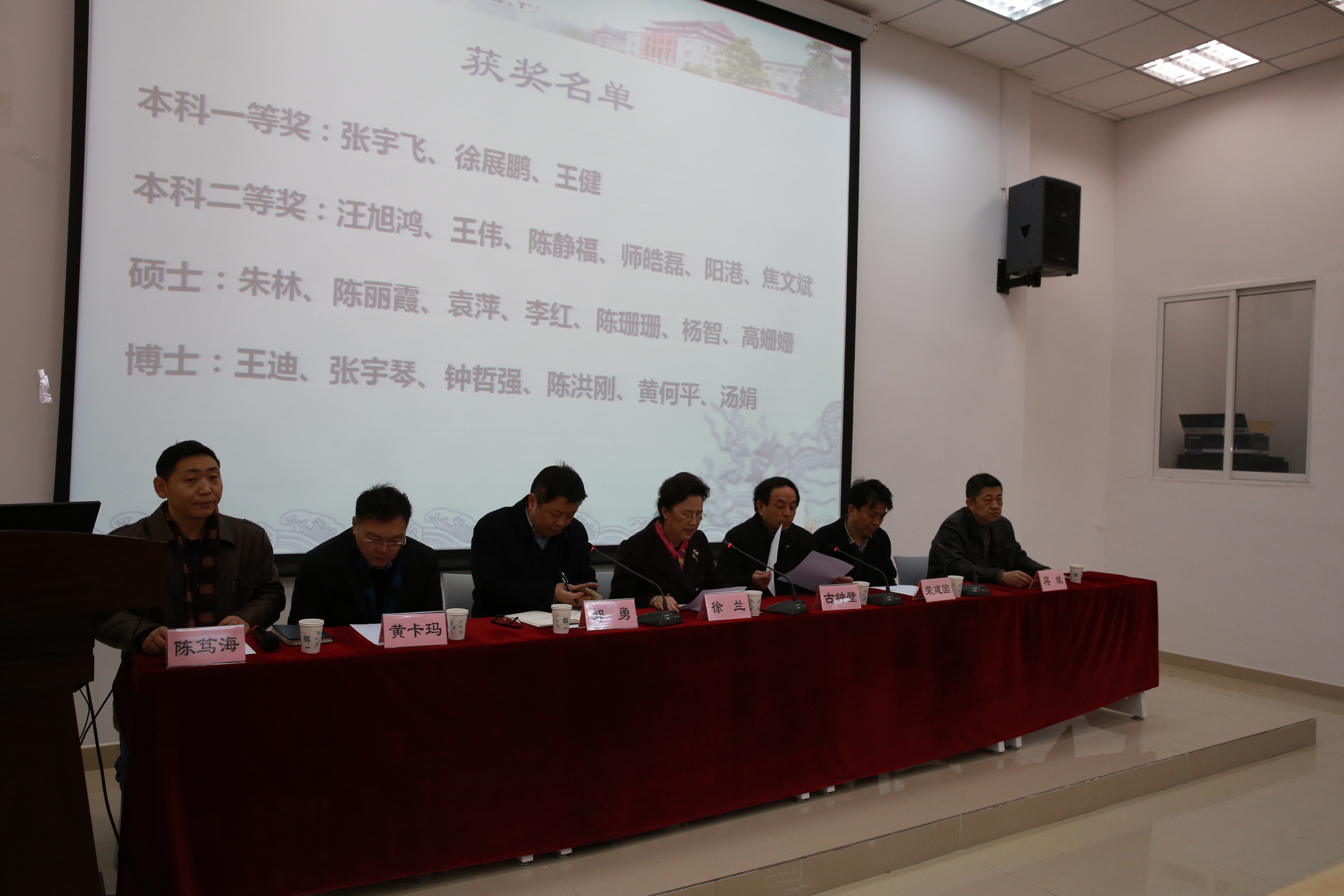 华文奖学金”获奖同学名单。紧接着,徐兰书记、古钟璧教授、郭勇部长、荣建国秘书长、蒋斌书记和黄卡玛院长为张宇飞、徐展鹏等22位获奖同学颁发了获奖证书。本科一等奖获得者,2014级本科生徐展鹏代表获奖同学进行了发言。他首先表达了对古钟璧教授和学校的感谢,也表示将会继续努力学习,不断提高自身综合素质和能力,回报母校、回报社会。
