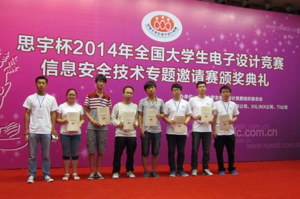 的钟亮、章良、陈玥组成的队伍凭借“基于指纹密钥保护的USB-KEY安全应用”获得软件组全国二等奖;刘梓溪、赵玲、陈鑫斌组成的队伍凭借“基于XMPP协议的语音隐藏通信系统-TalkSafely”获得软件组全国三等奖;卢方舟、许荣森、刘磊组成的队伍凭借“基于混沌压缩感知的安全图像采集与还原系统”获得TI平台组全国三等奖。