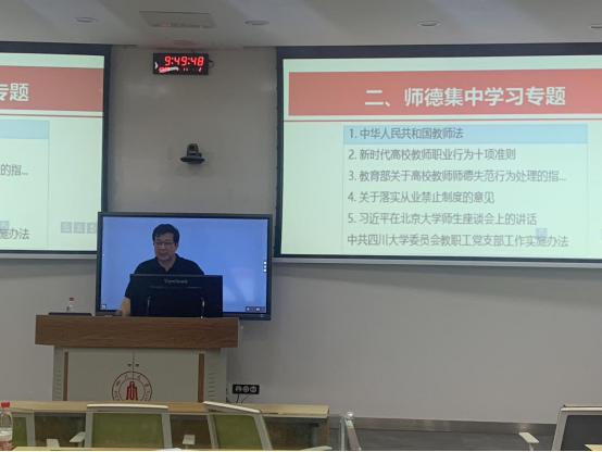 在望江校区基教C104召开2023年上半年全院教师大会暨师风师德教育专题会。学院全体领导班子成员、全体教职工参加会议。会议旨在深入学习贯彻党的二十大精神,扎实推进主题教育,总结学院上半年工作成绩,部署学院下一阶段工作,动员全院教职工攻坚克难重成效,自强不息开新篇,加快推动学院高质量内涵式发展再上新台阶。会议由学院副院长卿粼波主持。