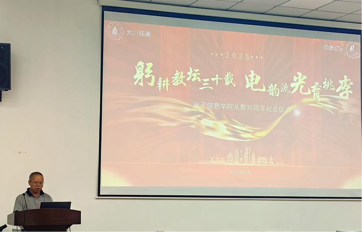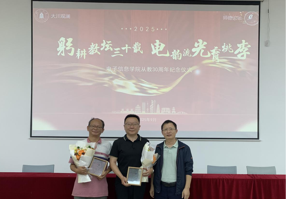 大川观澜师德讲堂“躬耕教坛三十载 电韵流光育桃李”——从教30年纪念仪式在此隆重举行。学院全体教师以最崇高的敬意,为将毕生心血奉献给教育事业的三位老师举行了一场简朴而庄重的致敬典礼。