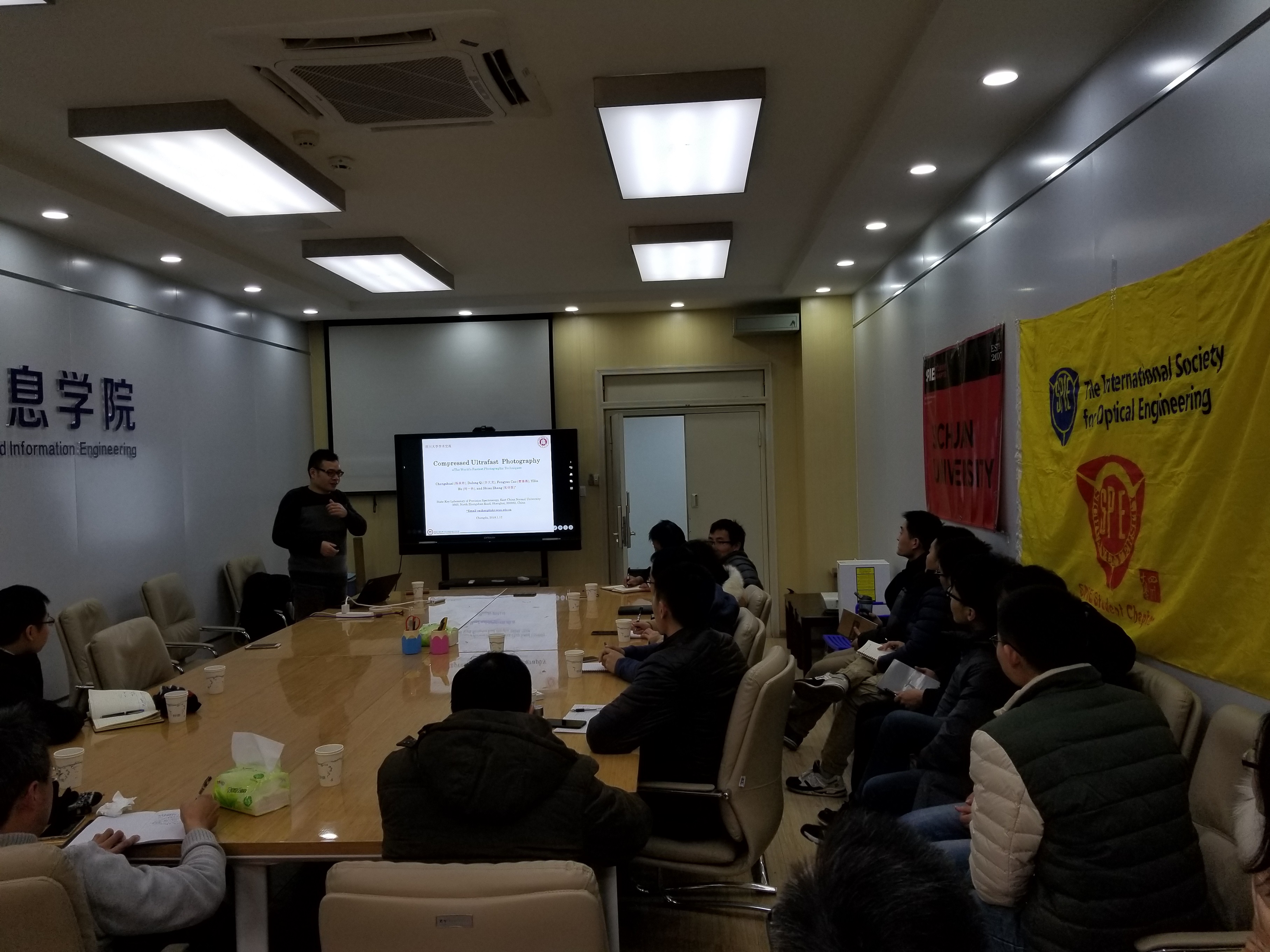 副院长张启灿教授的带领下,张诗按研究员参观了三维传感与机器视觉实验室,对实验室的工作表现出极大的兴趣,与实验室师生进行了交流讨论。随后在基础教学楼A110会议室,张诗按研究员首先听取了张启灿教授介绍本实验室工作,张启灿教授回顾了历年来的实验室的科研成果,着重讲述了课题组在动态三维面形测量领域所做工作。紧接着张诗按研究员为在场师生带来题为“Compressed Ultrafast Photography”的报告,学院张启灿教授,李大海教授,陈文静教授,刘元坤副教授,王君副教授等到场聆听。张诗按研究员详细介绍了所在团队提出的单次压缩超快摄像(cup)技术这一世界上最快的图像拍摄技术,该技术将压缩传感与条纹相机相结合,将成像速度提高到每秒1012帧,比现有技术提高约5个数量级,此技术可应用于纳秒和皮秒量级超快物理、化学、生物等过程的二维图像测量,同时也有望应用到信息安全与通讯保密领域。报告结束后,在场师生对此工作表现出极大的兴趣,与张诗按研究员展开了激烈的讨论。