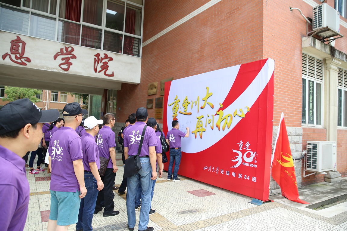 离开会场,大家来到了学院精心准备的签名墙前,看到“重逢川大,再问初心”八个大字,校友们感慨不已,纷纷上前签名留念。