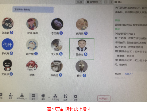 早上8:20雷印杰副院长在线开始了教学方法与技能的培训环节。雷印杰副院长结合学院专业课程教学要求,对助教承担教学辅助工作的具体要求如随堂听课、收集作业、辅导答疑、组织课堂讨论、协助教师批阅作业等工作及学生对助教评教进行了讲解,并就助教提升思维模式、增强知识能力、主动加强和任课老师、学生沟通、高效负责完成教辅工作等教学方法运用能力进行了培训。