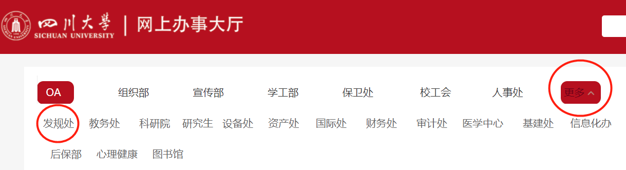 Ⅱ.进入网上办事大厅后,依次点击红圈中的“更多”——“发规处”——“评教历史数据查询”图标。