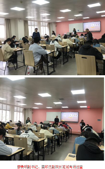 4月25日上午笔试完后,组织答卷密封、阅卷在学院基教A110会议室进行,廖勇明副书记、雷印杰副院长现场检查了工作。学院实行命题和阅卷独立,三位阅卷老师流水阅卷。教学科2名老师协助阅卷老师复核、统分、录入成绩。
