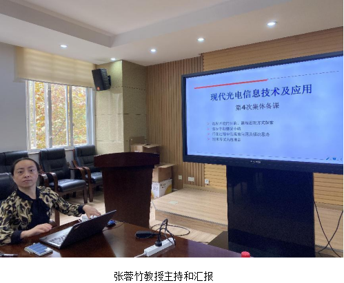 会上张蓉竹教授介绍了《现代光电信息技术及应用》课程的开设目的、培养目标、教学内容、课程设计等,对半学期以来课程相关章节的重点和难点、前3次集体备课、学生课堂及时反馈后的情况进行小结,着重对课程挖掘课堂思政元素方式的探索、行课过程中发现的问题及解决思路、期末考试非标答案出题和课程组老师们进行了研讨。