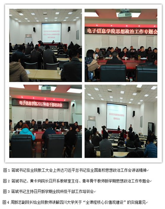 3、积极学习国家和学校重要教育方针政策,加强教师思想政治素养,立德树人。2月27日-3月3日,学院先后组织召开了领导班子、科级干部、系教研室主任、全院教工大会学习传达了会议上的重要讲习近平总书记在全国高校思想政治工作会讲话精神、教育部党风廉政建设视频会精神、MX动漫