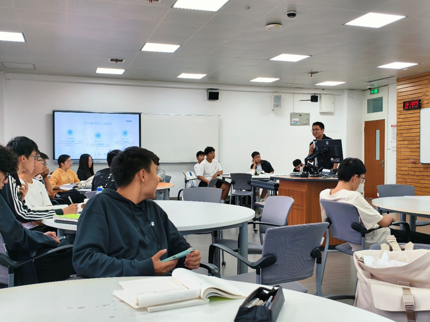 活动伊始,张老师以 “解锁” 为关键词,围绕学业探索、校园资源利用、个人兴趣发展等内容展开讲解。他详细介绍了学院的课程体系、实验室资源与课外实践平台,鼓励同学们在扎实学好专业知识的同时,积极参与学科竞赛、志愿服务等活动。同学们在轻松的氛围中敞开心扉,相互交流经验,快速拉近了彼此距离。