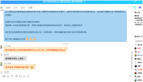 24日晚上8点,邰明松书记、冯国英院长组织召开了线上教学经验交流会,雷印杰副院长主持。三位领导认真听取了第一天上过课的老师们反馈意见,并要求会后把老师们的意见整理成文,供全院老师参考学习,不断提高线上教学质量。已上课和未开课的老师积极入群交流学习,QQ群里老师们积极发言,真诚分享,研讨气氛热烈。