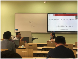 会上,教务处严斌宇副处长表示,因为疫情,在线教学已经成为中国高等教育和世界高等教育的重要发展方向,面对“新常态”的需求及学校疫情防控工作实际,学校决定2020年春季学期学生部分返校后,上课课程采用线下/线上同步教学模式,已返校学生在教室上课,未返校的学生在线上课。教务处一直在推进线上线下同步教学的实施,积极探索利用教学督导系统进行教室内线上教学的解决方案,目前教室已经实现线上线下教学互动完全同步。通过现教中心提供网络技术线上的支持,教师在教室讲台上的电脑上登录腾讯会议、welink等线上平台,未返校同学可以通过这些平台线上进行实时上课。