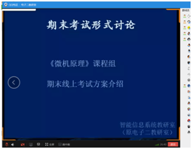 《微机原理与接口技术》课程组的教师代表卿粼波副教授介绍了该课程组关于此次期末考试的考虑,拟采用合适的考试形式避免学生死记硬背,重点考查分析能力;此外,关于发送试卷的方式和单/双机位等具体细节也进行了仔细考虑。赵成萍副教授进行了相关补充。