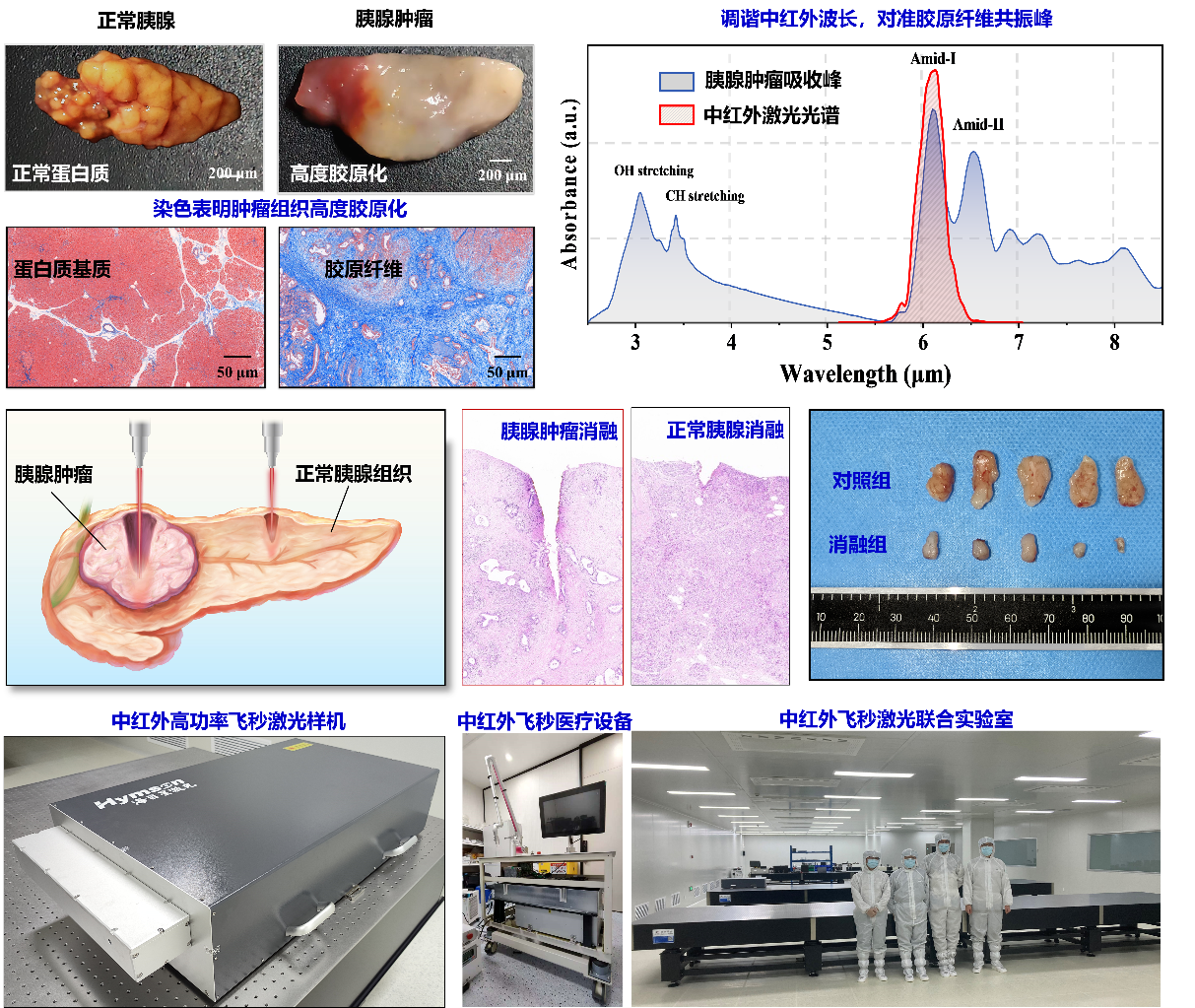中红外飞秒激光及应用工科特色团队在梁厚昆教授的带领下,开展光学、临床医学、材料科学等方向交叉研究,长期从事高功率中红外飞秒激光和微创消融技术研发工作。团队结合5-10 µm的长波红外波长激光的生物分子强共振特性与飞秒激光冷消融特性,研发中红外飞秒医疗设备取得重要进展。基于国产大禁带宽度的LiGaS2和BaGa4S7晶体,创造了2.4瓦长波红外飞秒激光功率记录,将原纪录(1.3瓦,2023年物理诺奖Ferenc Krausz教授课题组)提升了近2倍,满足医用要求;与华西医院胰腺外科临床医生合作,首次基于与胶原纤维共振的6.1μm飞秒激光,实现了胰腺肿瘤高效选择性消融,消融比1:3,可显著保留健康胰腺组织,为胰腺肿瘤的微创治疗提供了全新的技术路径。该工作发表在Optica,被美国光学学会新闻长篇报道。目前,团队与某上市公司建立中红外飞秒激光联合实验室,并联合华西医院建成中红外飞秒激光微创治疗平台,研制的中红外飞秒医疗设备已进入临床验证阶段。