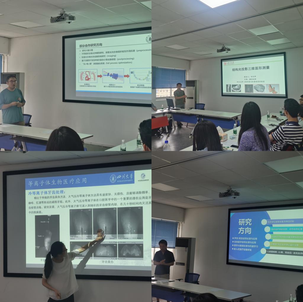 申俊飞副教授、刘元坤副教授、吴丽副教授、潘帆老师针对华西口腔医学院提出的需求,并结合自身目前的研究基础进行了详细的PPT报告,双方的交流非常热烈,在两个主题上都找到了很好的合作点。