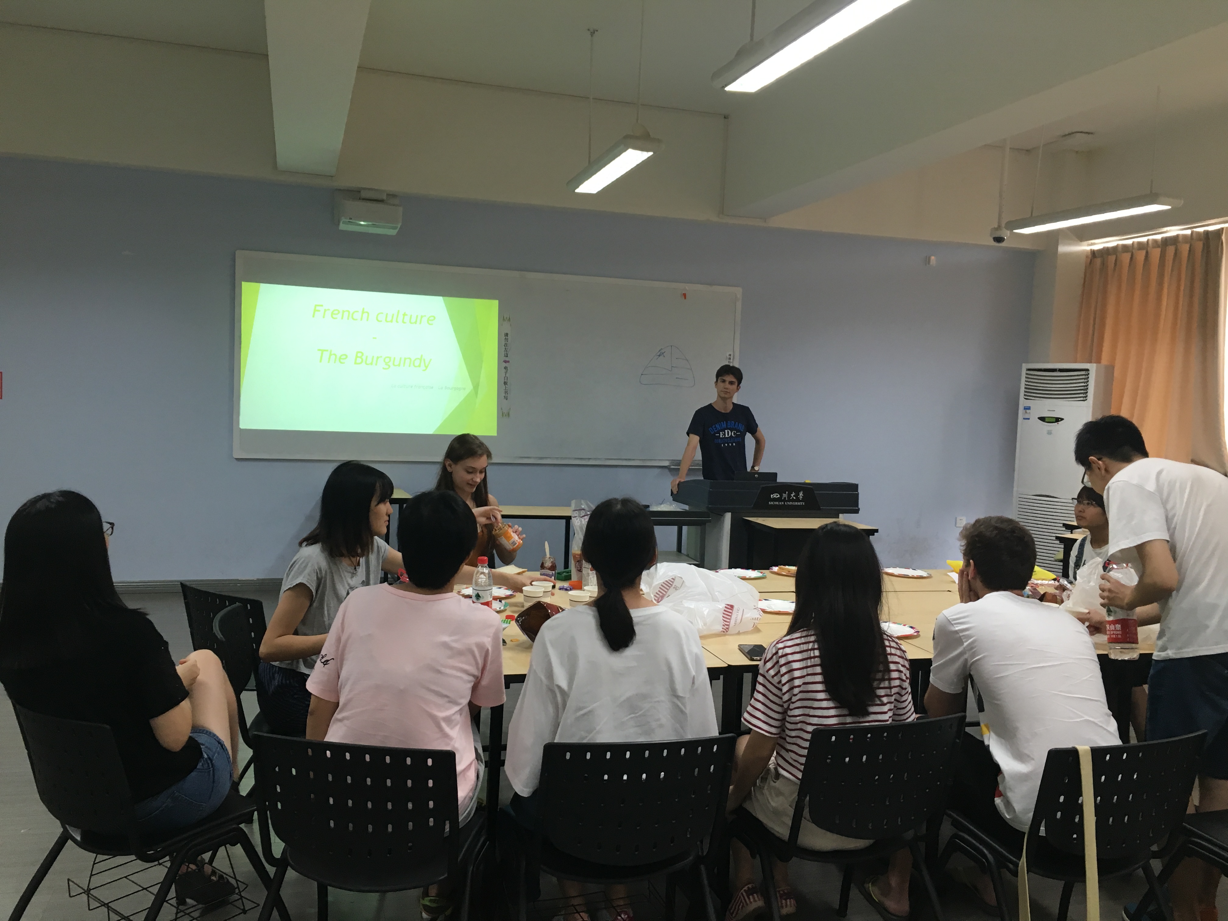 之后,来自美国的Kameron同学给我们讲了美国的国旗的含义、主要节日、著名的自由女神像和他们的饮食文化等,同时现场她还带了一些不同他们爱吃的零食给我们品尝,玩了她教我们的游戏,经过一系列的活动,我们渐渐感受到了中美文化差异。另外两个法国同学Louis和Alex也分别给我们展示了他们自己家乡的概况、饮食、地理环境和一些很特别的建筑等。他们还告诉我们在中国很方便,因为在法国买东西要去城市里的市场,而且一般晚上8点以后街上的商店就都关门了,但在中国深夜出去也会有夜市。接着MX动漫