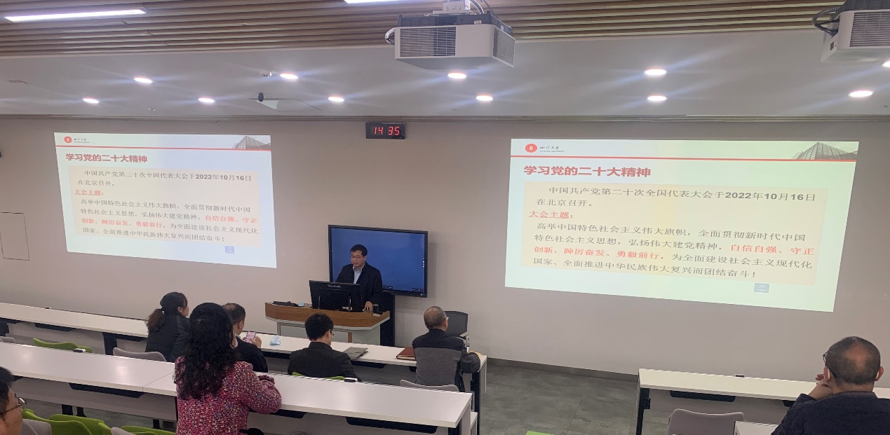 组织开展了学习党的二十大精神专题学习会,学院全体教职工参加了本次专题学习会。专题学习会由学院党委书记邰明松同志主持并主讲。