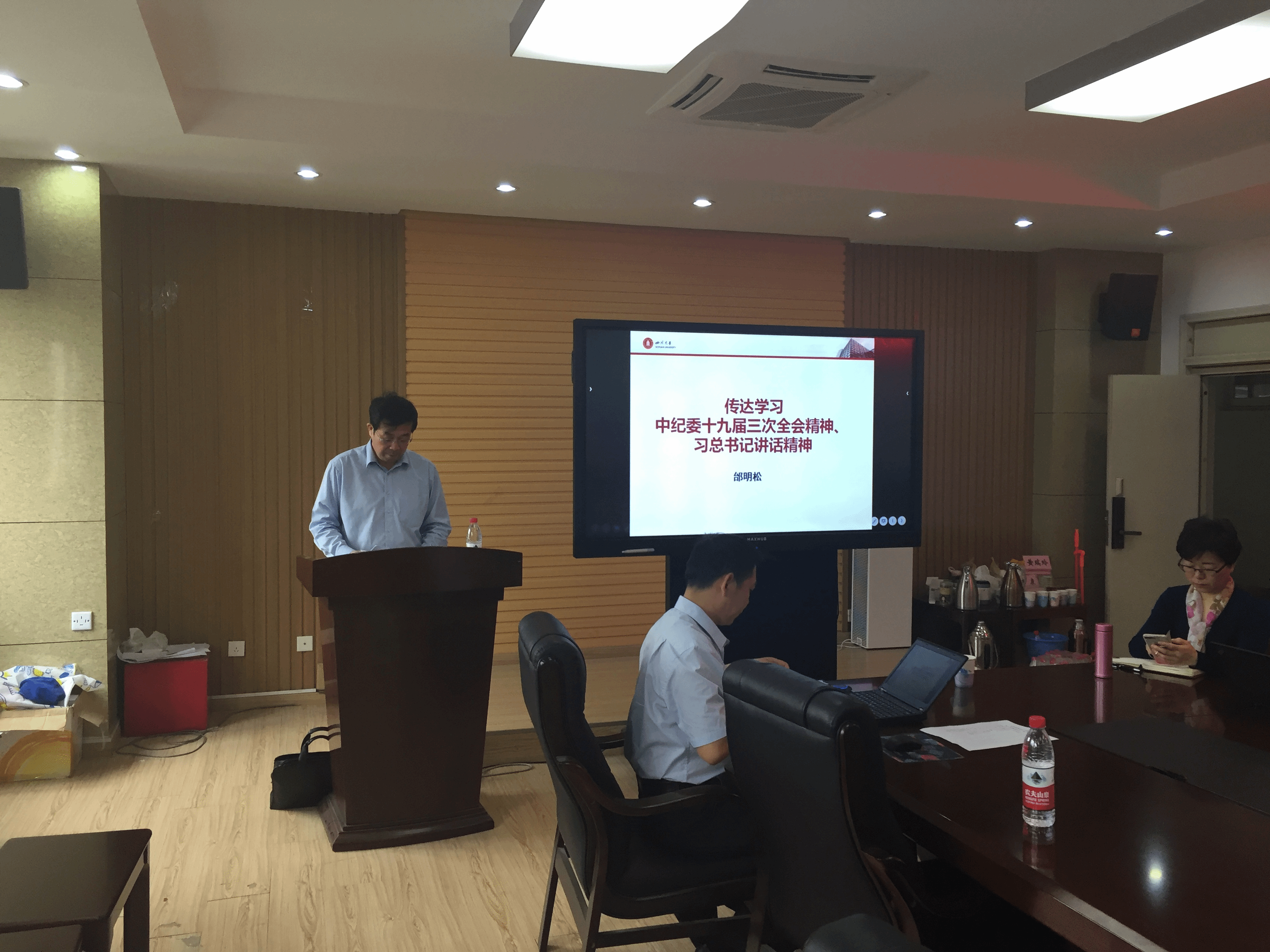 最后,邰明松书记就本次工作会议进行了总结讲话。他分别总结了纪委、教育部、学校关于全面从严治党工作的重要精神,并号召在座各位结合工作实际,以问题为导向,就学院在巡查工作中存在的问题进行整改,持续做好全面从严治党工作。