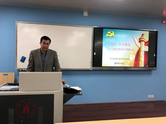最后,由邰明松书记做“‘不忘初心,牢记使命’我们的责任和担当”为主题的党课教育讲话。他结合很多支部在介绍各自的党建活动时提及的新中国成立70周年阅兵仪式,借用习总书记对此次阅兵仪式的概括“国之大典,气势恢宏,大度雍容,纲维有序,礼乐交融”这五个词,强调新中国成立70周年的阅兵仪式给一个人民、一个民族带来的强烈民族自豪感和荣誉感,由此引导大家思考自身的责任和担当。他还谈到了习总书记在“庆祝改革开放40周年大会”上的部分讲话内容,紧密结合了近代以来实现中华民族伟大复兴的三大里程碑:建立中国共产党、成立中华人民共和国、推进改革开放和中国特色社会主义事业,强调各支委在开展相关会议讲话精神的学习和讨论时,要认真对待,充分结合党和国家的发展历程,不忘初心,牢记使命,让各支部成员都能深切体会到开展主题教育活动的重要意义。