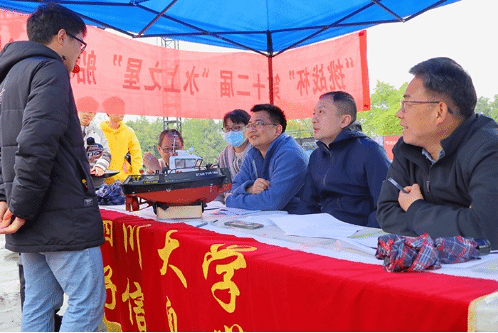 党委邰明松书记宣布本次船模设计大赛决赛正式开幕。在最先进行的答辩评分环节中,参赛选手们向评委们介绍自己船体的相关理念和技术,同时评委们也提出了一些专业问题以更好的了解同学们的设计思路。下午一点半,哨声一响,精彩纷呈的水上竞速环节正式开始。选手们聚精会神地操纵船只,在各个浮标之间穿梭,完成一次又一次完美的转弯。红旗在船模上高高飘扬,欢声笑语响彻在景观水道上空。下午五点半,随着最后一艘船抵达终点,本次船模设计大赛圆满落幕。