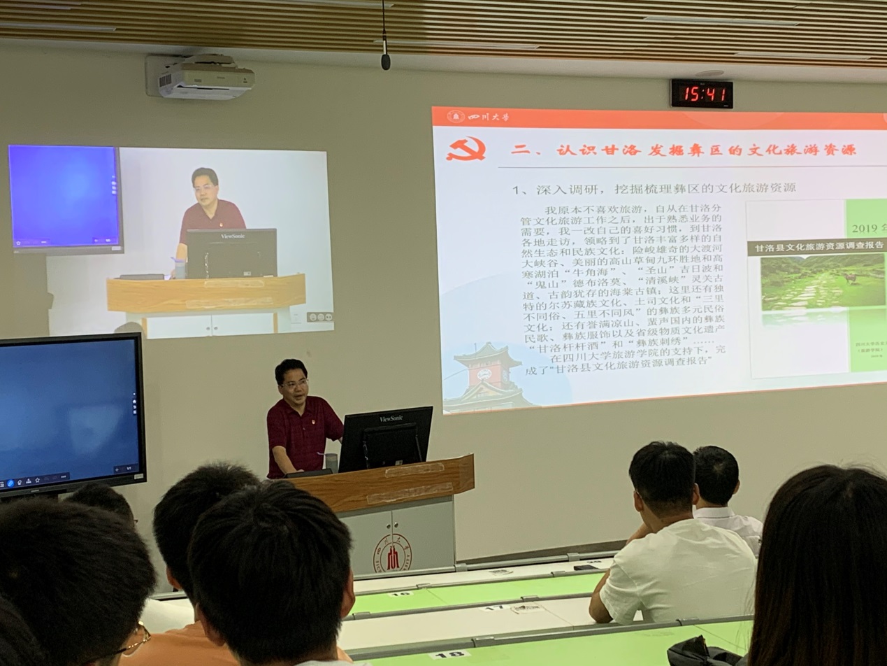 陈炳周同志还结合他自己担任挂职副县长对口支援的甘洛县在脱贫攻坚工程中取得的成绩与与会同志进行了分享和交流。他通过讲解和播放视频等多种方式从从中原农乡到西南彝区、认识甘洛:发掘彝区的文化旅游资源、深入基层:高质量完成脱贫攻坚分管专项任务、情系斯觉:建设彝区新乡村、发挥川大优势:扎实开展教育- - 智力扶贫、总结与思考等六个方面讲述了自己在甘洛县担任挂职副县长对口扶贫的切身感受、开展的具体工作和甘洛县取得的成绩,展示了甘洛县的新风貌。