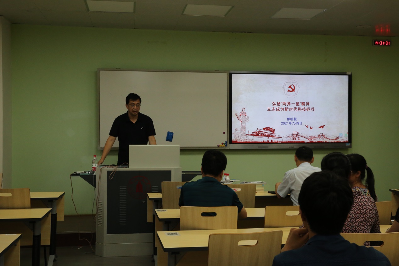 在望江校区基础教学楼A307室召开了党史学习教育专题党课。学院党委委员、纪委委员、教职工党员代表、本科和研究生新入党学生代表参加了本次党史学习教育专题党课。专题党课由学院党委副书记陈笃海主持,学院党委书记邰明松作了题为《弘扬“两弹一星”精神立志成为新时代科技标兵》的专题党课。