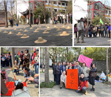 除了品尝美食,还安排了团队建设的环节,更好地锻炼了老师们的团队协作能力。工作人员将30多位老师分组,组成了3个队伍,大家各自饶有兴趣的给自己的队伍赋予了队名和口号,并为自己的队伍誓师和鼓气,准备和其他队伍一较高下。接着开始了第一个游戏——“连连看”,需要从被草帽盖住的物品里面同时找到两个相同的东西,然后就拿走奖品,最后拿到的奖品和草帽最多的队伍胜利。这个游戏考验了老师们的记忆力、观察、沟通和团队协作能力。最后进行了“写毛笔字”的游戏,通过多名教师的协同合作,共同用特制的毛笔写下相同的字。这项活动既考验了老师们的团队协作能力,又让大家轻松愉悦、笑声不断。