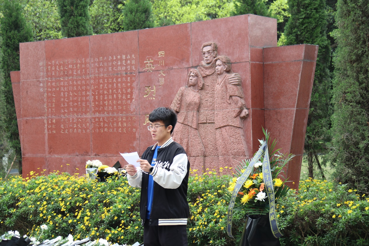 全体代表人员手捧鲜花,向革命先烈默哀一分钟。默哀完毕后,由2021级单文浩同学带领同学们进行宣誓。在宣誓过程中,同学们表情严肃,举止庄重,声音坚定且铿锵有力。宣誓完毕后,老师代表、学生代表依次向革命先烈献花,师生瞻仰革命烈士纪念碑,表达着对革命烈士深切的缅怀和崇高的敬意。