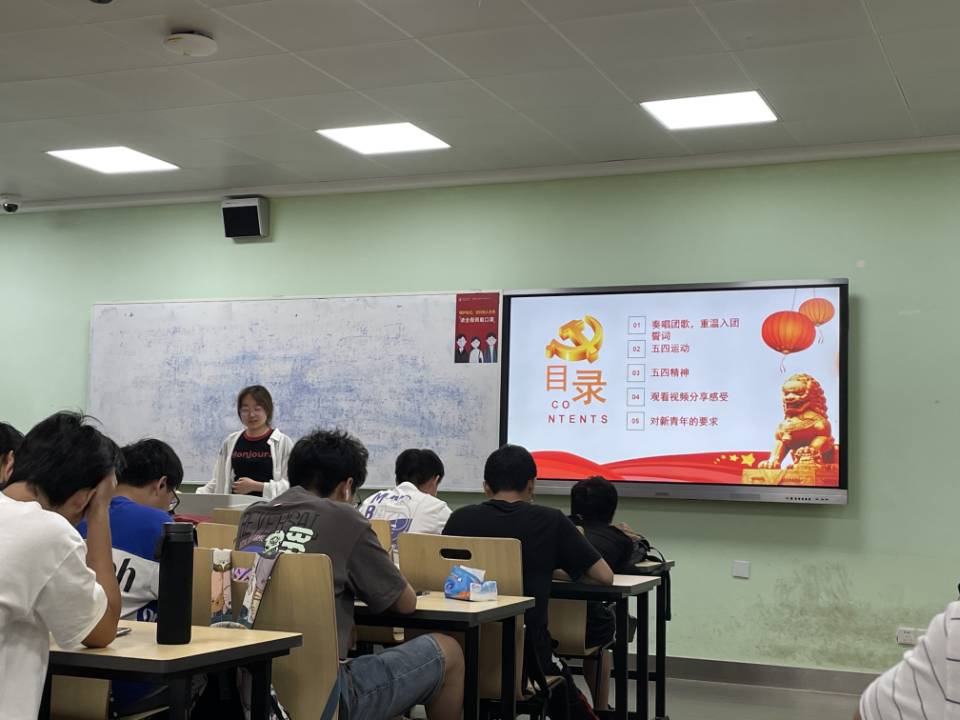 本次活动由团支书李任丽同学进行活动主持。活动伊始,在团支书的带领下,同学们唱团歌,回顾入团誓词。随后,团支书紧密联系团员思想学习工作实际发表讲话,引导广大团员厚植爱党、爱国、爱社会主义的情感,梳理远大理想,增强奋斗精神,争当中华民族伟大复兴的生力军。随后,同学们学习五四运动精神,观看了相关视频并发表自己的感想。有同学在分享中谈到,五四运动已经成为过去时,但是五四精神仍在现在进行时和将来时中演绎着,并将被不断赋予强大的精神内涵。这是对五四运动最好的纪念,也是对五四精神最好的弘扬。