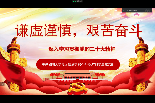 基教A303会议室线下参加活动,支部其余通知线上参加。在本次活动中,陈林老师就二十大中强调的“谦虚谨慎、艰苦奋斗”展开了深入的讲解介绍,同学们认真观看,用心领悟,积极发表学习感想。同学们表示,作为新时代青年人要及时跟进学、深入思考学,要把所学的内容联系实践,为实现中华民族的伟大复兴中国梦贡献力量。并且在生活学习工作上会牢记谦虚谨慎,艰苦奋斗的精神。