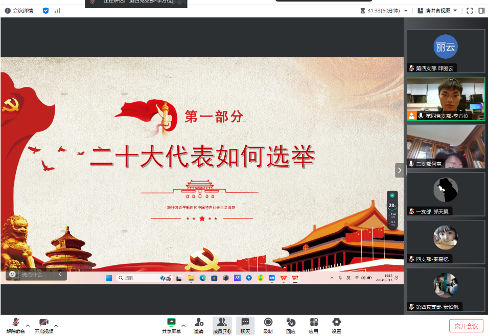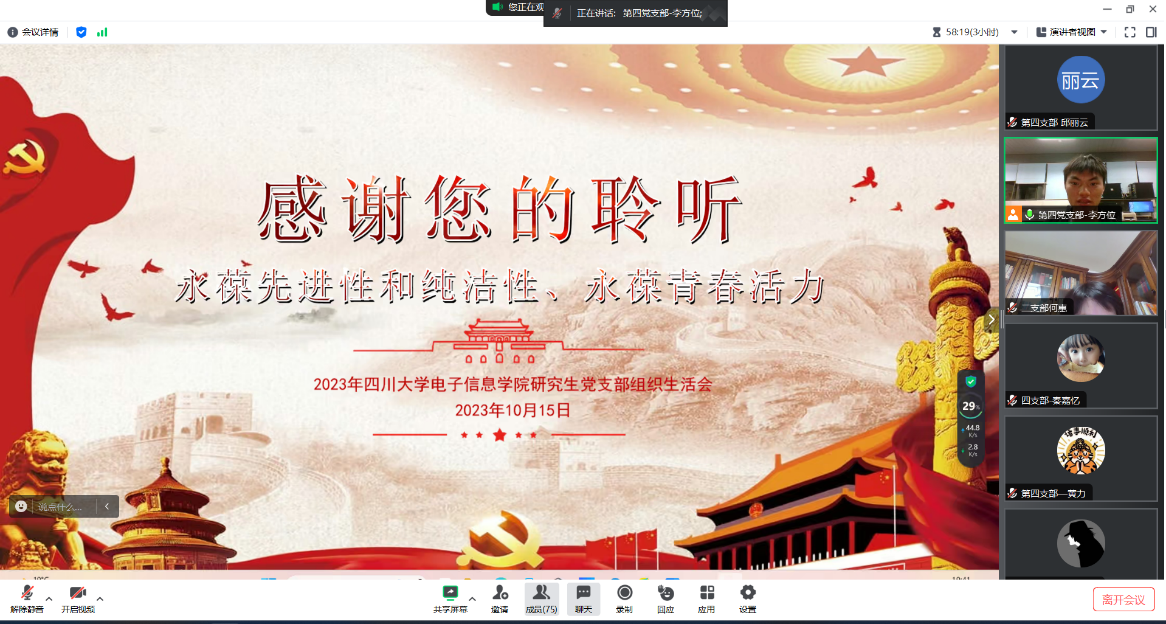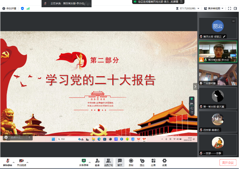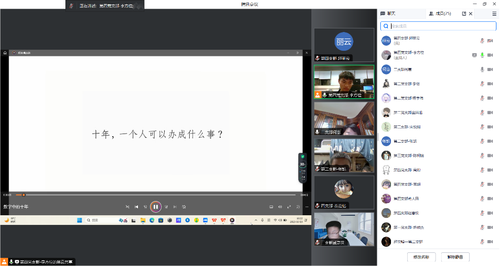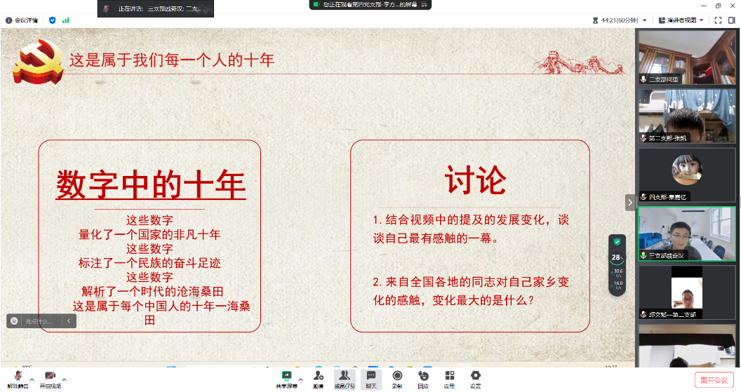 第四党支部副书记组织党员们观看了视频“数字中的十年”,来自不同地区的党员们结合家乡的发展变化和个人的成长经历,开展了积极的讨论。第一支部郭天翼同志讲述了在国家限制燃放烟花爆竹的管理规定下,家乡济南的空气环境质量有了很大的改善。第二支部孙笠晋同志讲述了中国高铁的建设速度以及乘坐高铁的便捷与高效。第三支部戚奇汉同志讲述了新冠肺炎疫情防控下,中国始终坚持人民至上、生命至上,把人民生命安全和身体健康放在第一位。第四支部黄力同志讲述了国家扎实推进乡村振兴,加强农村基础设施建设,农民的生活质量得到了很大的提高。