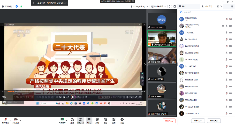 2023级研究生各党支部联合开展主题为“学习二十大,永远跟党走”的党支部学习大会。会议主要围绕“二十大代表如何选举”和“学习党的二十大报告”两个主题展开。本次会议以线上的方式举行,第二党支部书记兼2023级研究生辅导员何惠老师以及2023级研究生全体党员参加会议。
