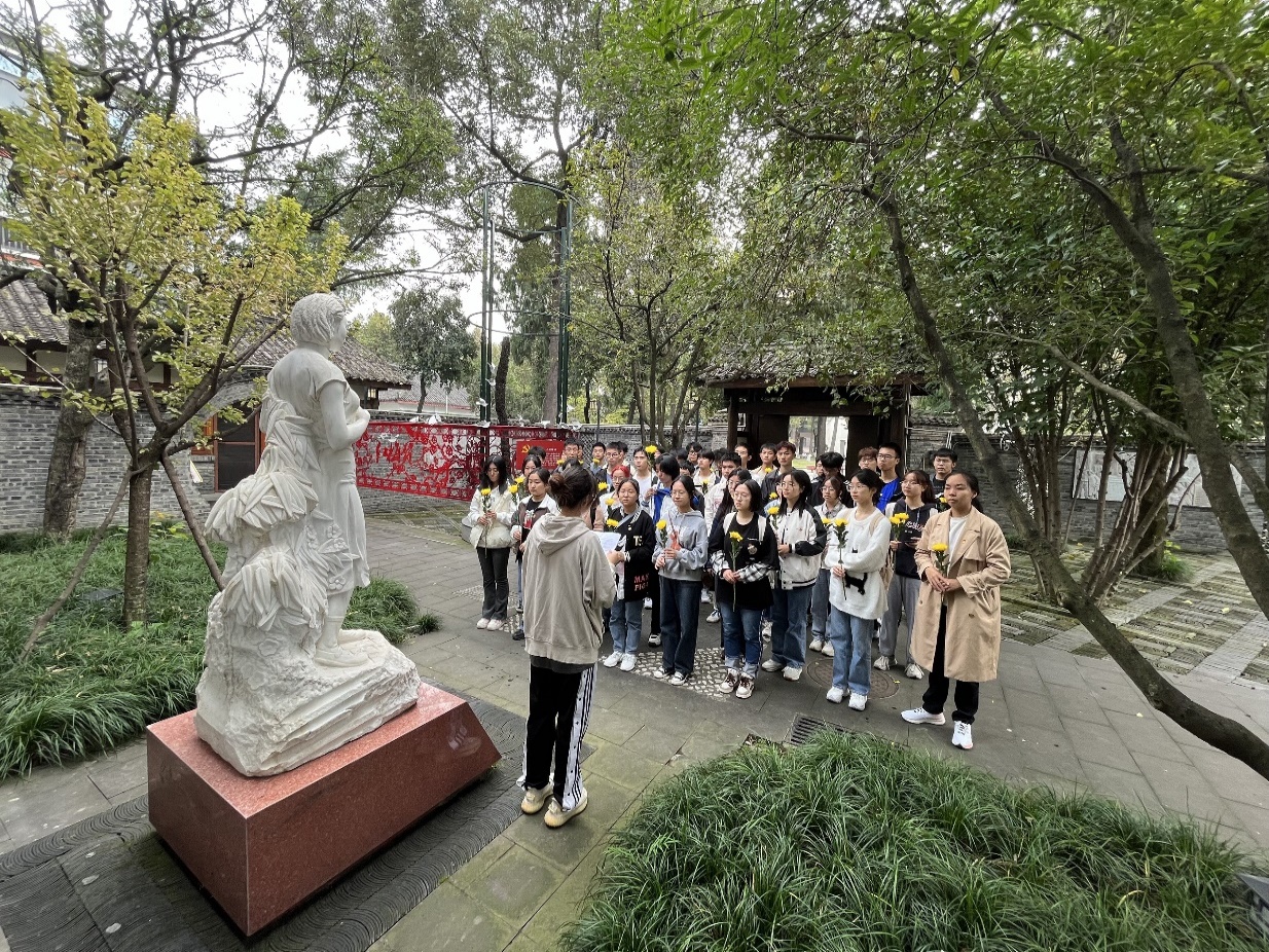 走出校史馆,前进数百米,便来到了江姐纪念馆。走进院门,便能看见院中央伫立着的那座静谧而庄重的汉白玉雕像,这座雕像生动地再现了作为川大学子的江姐的面容与姿态,令人顿生亲切之感。为表达对江姐的敬仰之情,同学们在雕像前进行了诗朗诵并依次上前献花。随后在讲解员的带领下,同学们前往馆内参观,不大的展厅、曲折的长廊正映射着江姐那短暂而崎岖的一生。馆内陈列的照片生动再现了那段革命的峥嵘岁月,我们似能听见江姐她在校中呼唤群众时慷慨的声调,看见她在狱中不屈不挠、视死如归的坚毅的面容。走出纪念馆,回忆着江姐短暂而辉煌的一生,同学们重温了入团誓词,“我志愿加入中国共产主义青年团,坚决拥护中国共产党的领导..... ”铿锵有力的宣誓声响彻了院落。