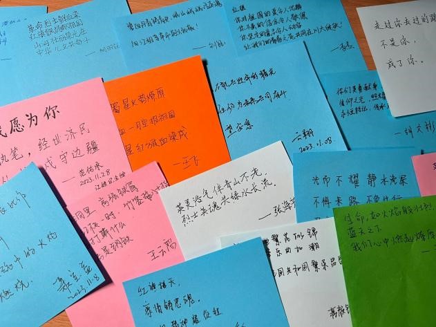 参观完成后,团支部书记组织全体团员开展了“写给江姐的‘三行情诗’”活动。很多同学被栩栩如生的复原景象所感动,也被革命先辈和英模的事迹所鼓舞。大家纷纷写下自己心中的感想。很多同学表示要向先辈学习,要传承革命精神,尤其是要学习江姐把小我融入大我的情怀,在新时代新征程上为强国复兴贡献出自己的力量。
