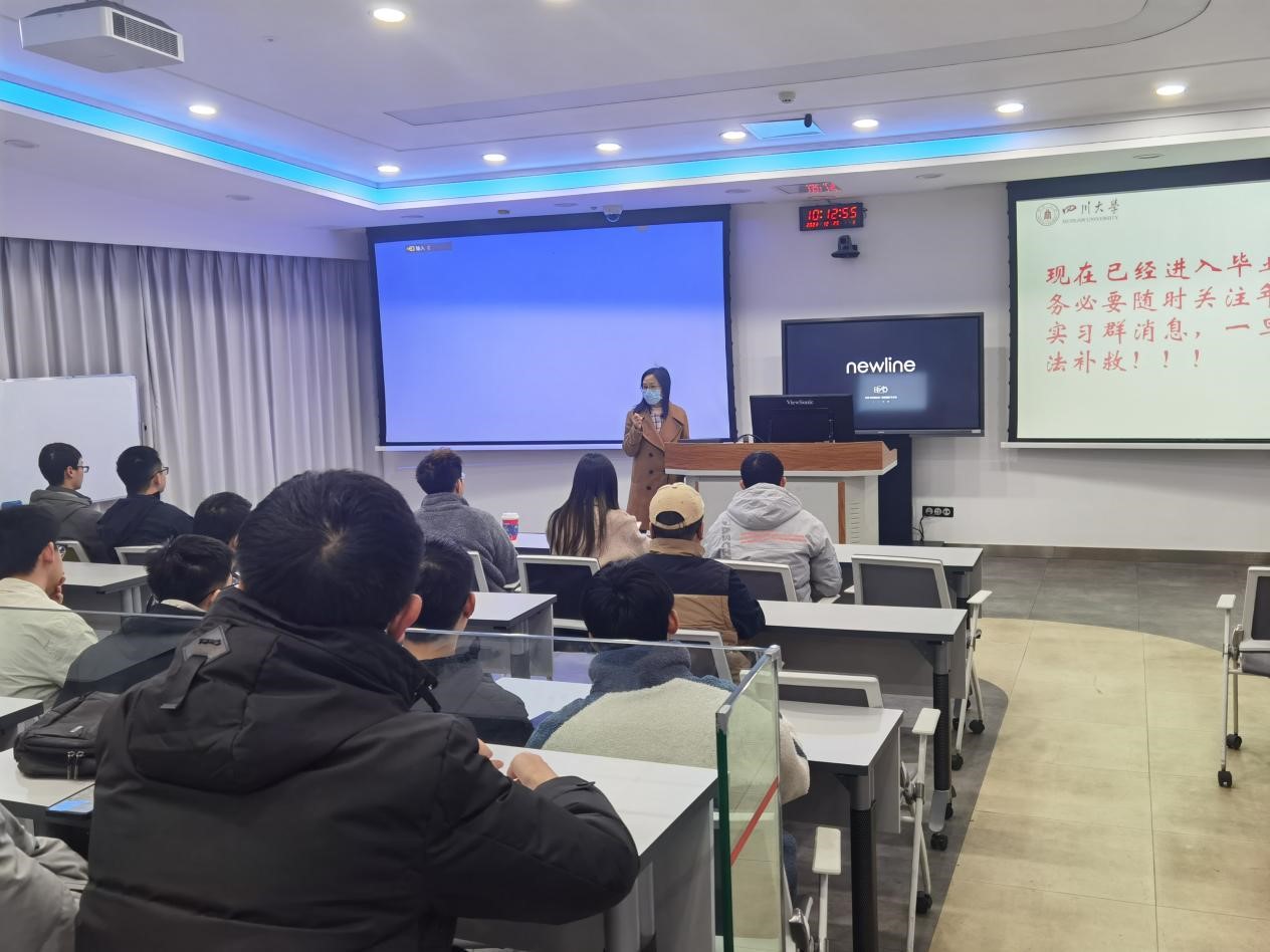 在基础教学楼C座103教室召开2024届毕业生实习动员会。学院辅导员陈晓娟老师组织全体学生开展实习前动员大会。