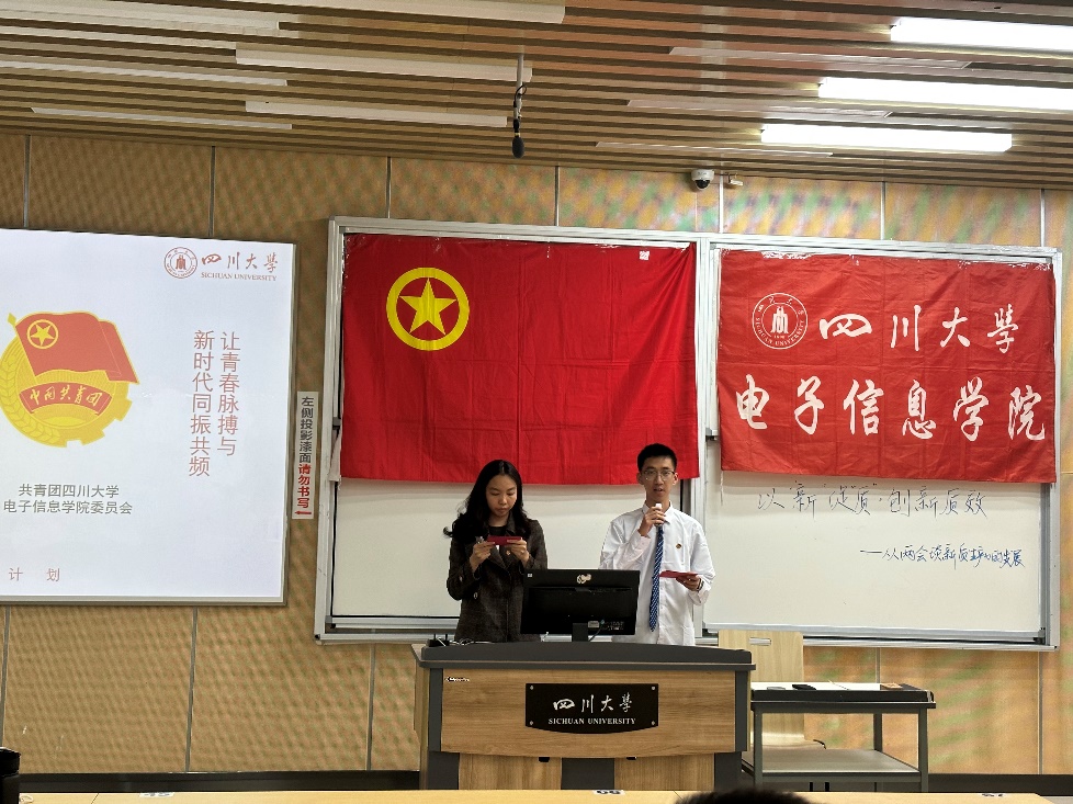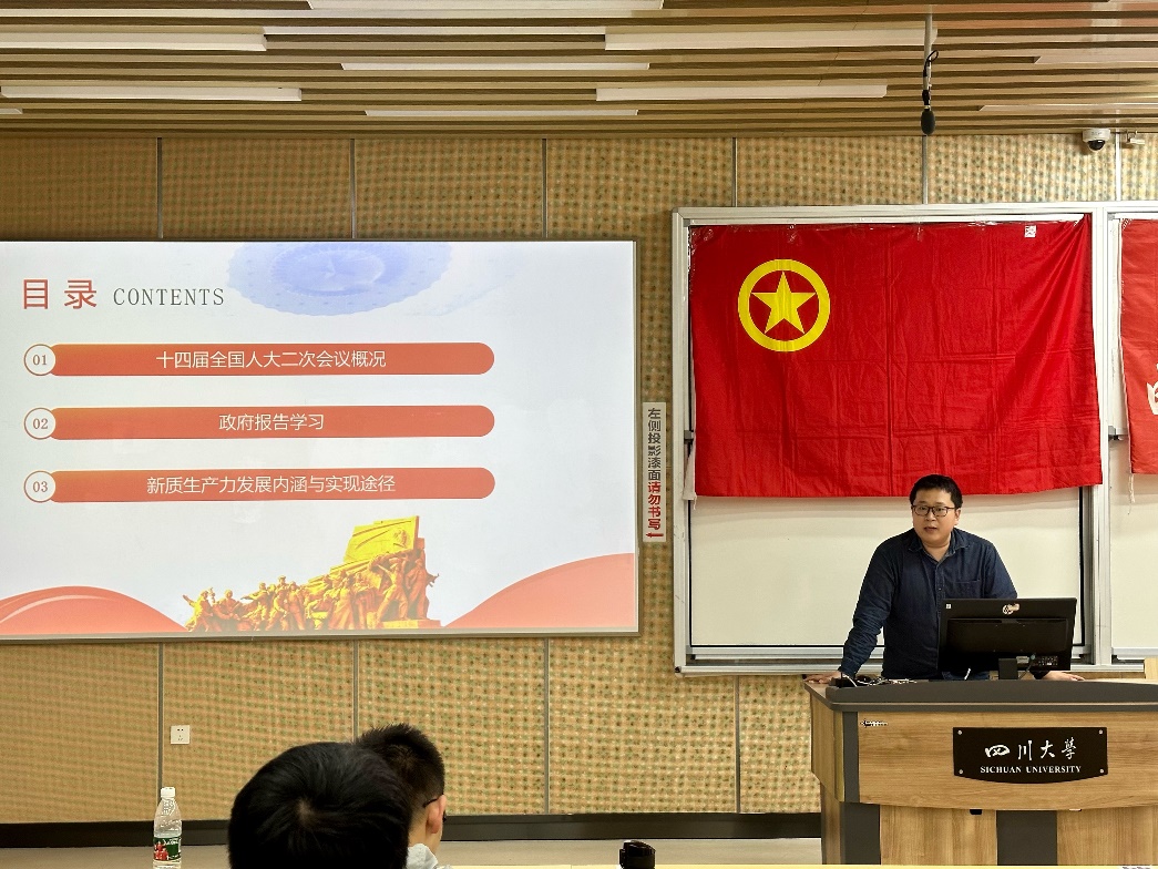 傍晚七时,大会在整齐的团歌声中正式拉开序幕。申鑫老师依据两会重要精神及会议内容,分别从今年两会概况、政府报告学习和新质生产力的发展内涵与实施路径这三个部分进行授课,重点对新质生产力的特点、要求、核心要素等方面进行阐述,让同学们了解到创新创造特别是原始创新对国家高质量经济发展的重要意义,勉励同学们要不断地开拓思维、自立自强,为更好地发展新质生产力打下基础。