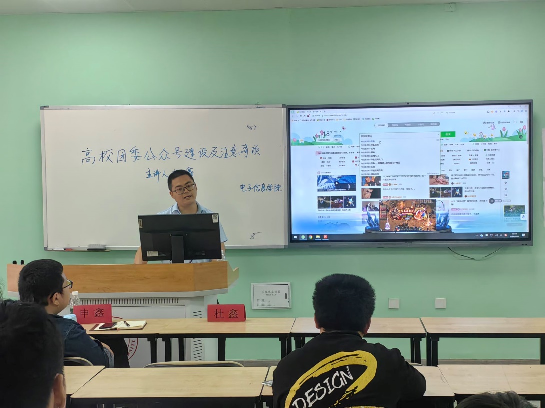 “高校团委公众号建设与注意事项”新媒体培训讲座于江安校区综合楼B204教室举行,由团中央“青年讲师团”讲师杜鑫主讲,院团委副书记申鑫、兼职辅导员肖嘉敏和院学生组织宣传工作主要负责同学参与。