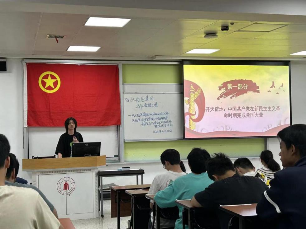 在“理论学习”板块中,网络空间安全学院2023级网络空间安全与法学专业201团支部团支书张珈乐带领大家进行红色党史的学习。在学习过程中,团支书张珈乐深情回顾了党的奋斗历史,热情讴歌了党的光辉业绩,激励同学们发扬党的光荣传统和优良作风,激发大家的爱国主义情感。