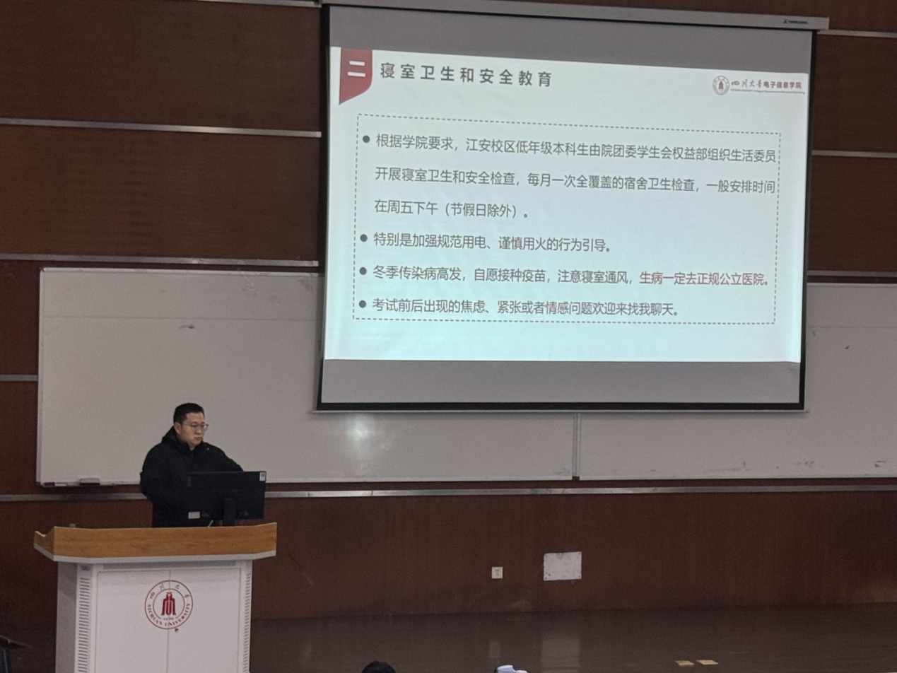 申老师提出将每月开展一次本年级的寝室卫生和安全检查,特别加强用电和用火的行为管理。冬季传染病高发,鼓励大家可自愿接种疫苗,注意保暖,生病时应去正规公立医院就医。同时,考试前后学生可能出现的焦虑情绪,申老师表示可随时找他进行沟通交流。