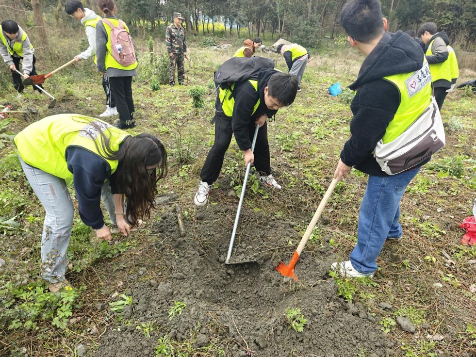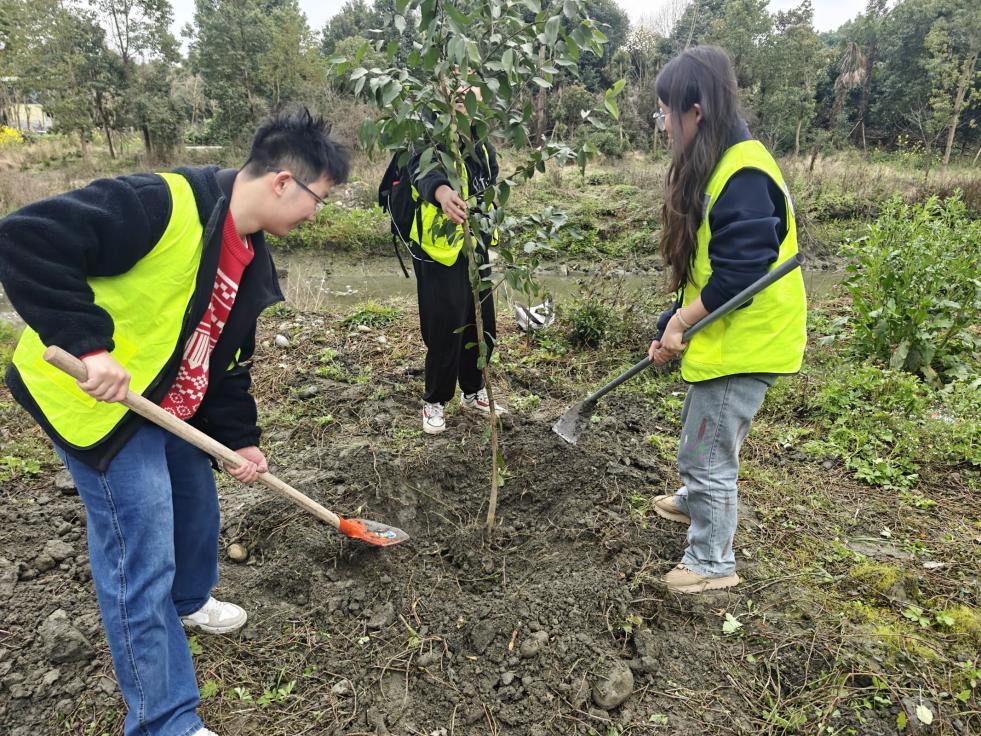 “这株香樟树要深埋,根系才能抓牢土地”,林业技术员手把手教同学们辨认树苗品种、掌握种植技巧。同学们或蹲身培土,或合力抬水,衣角沾满春泥,却掩不住眼里的光。经过两小时的劳作,一株株嫩绿的香樟树苗在春风中舒展枝条,与“绿色使者”点头致谢。