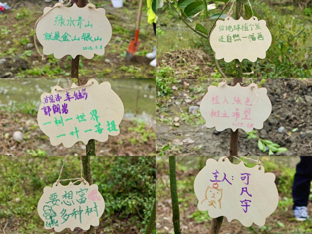 当株株新苗在坡地上挺起稚嫩的脊梁,活动最动人的环节——为亲手栽种的树苗定制“绿色身份证”也在春阳下展开。同学们领取原木色树牌与彩笔,有人用苍劲笔锋写下“绿水青山就是金山银山”,寓意生态与经济的共生共荣;“给地球植个发,还自然一幅画”俏皮标语的萌趣设计引得众人会心一笑;三位同学以“一树一世界,一叶一菩提”为引,让禅意与绿意相映成趣。更有同学将心声化作诗行:“植入绿色,树立希望”,植入的是盎然的春意,树立的是未来的邀约;而接地气的“要想富,多种树”标语更是展现了和谐的氛围。