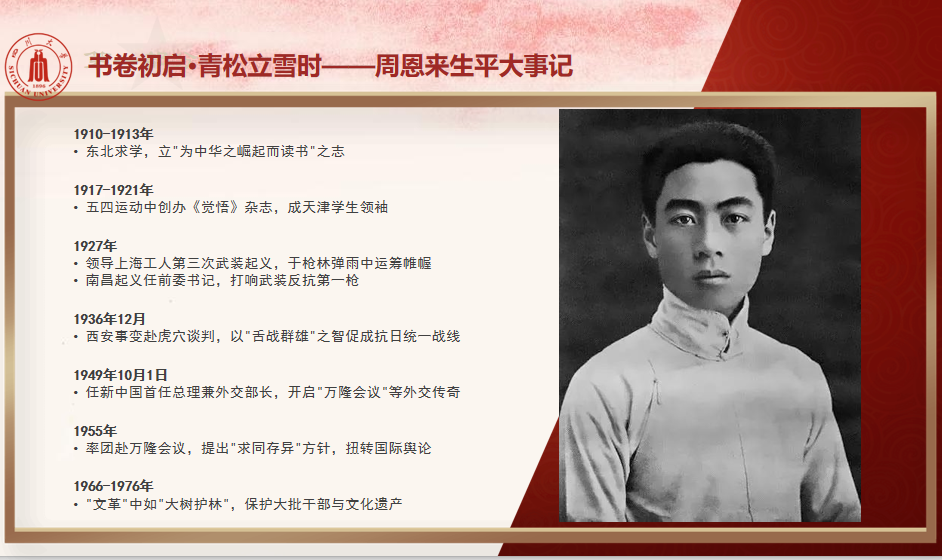 最后是胡宇昕、钟佳秀小组分享周恩来总理的青年历程。钟佳秀从周恩来总理的求学之路讲起,以周恩来总理的思想变化历程为线索讲述了其青年时期的重要事件,最后从内外两方面分析了周恩来总理为什么会成为一代伟人,展现了他作为中国革命伟大领袖的高尚品质和卓越才能,同时也反映了那个时代背景下中国社会的变迁和进步。