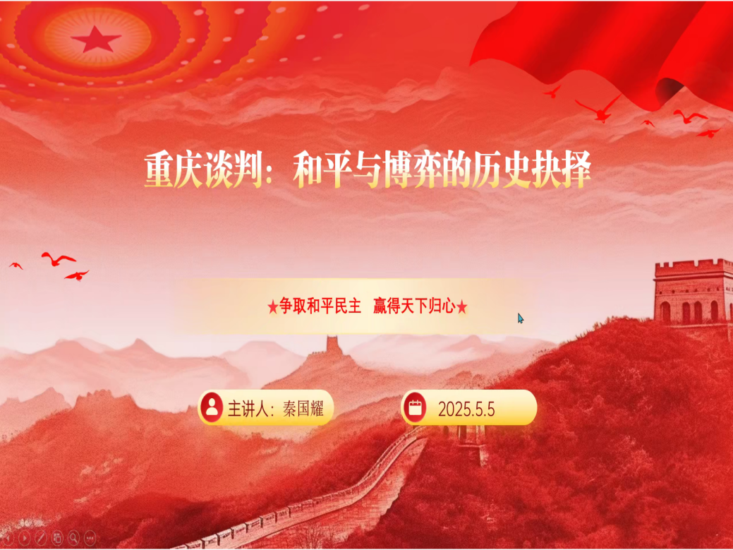 贺炫凯、张中豪、秦国耀小组分享的主题是:解放战争时期-重庆谈判。主讲人秦国耀为大家讲解完重庆谈判的历史背景过后,向大家提出了一个问题:如果你是当时的决策者,你会选择去重庆谈判吗?同学们纷纷陷入了思考。虽然谈判的过程异常艰难,但中国共产党坚持底线,争取主动,最终取得了阶段性的胜利,展现出高超的战略智慧。