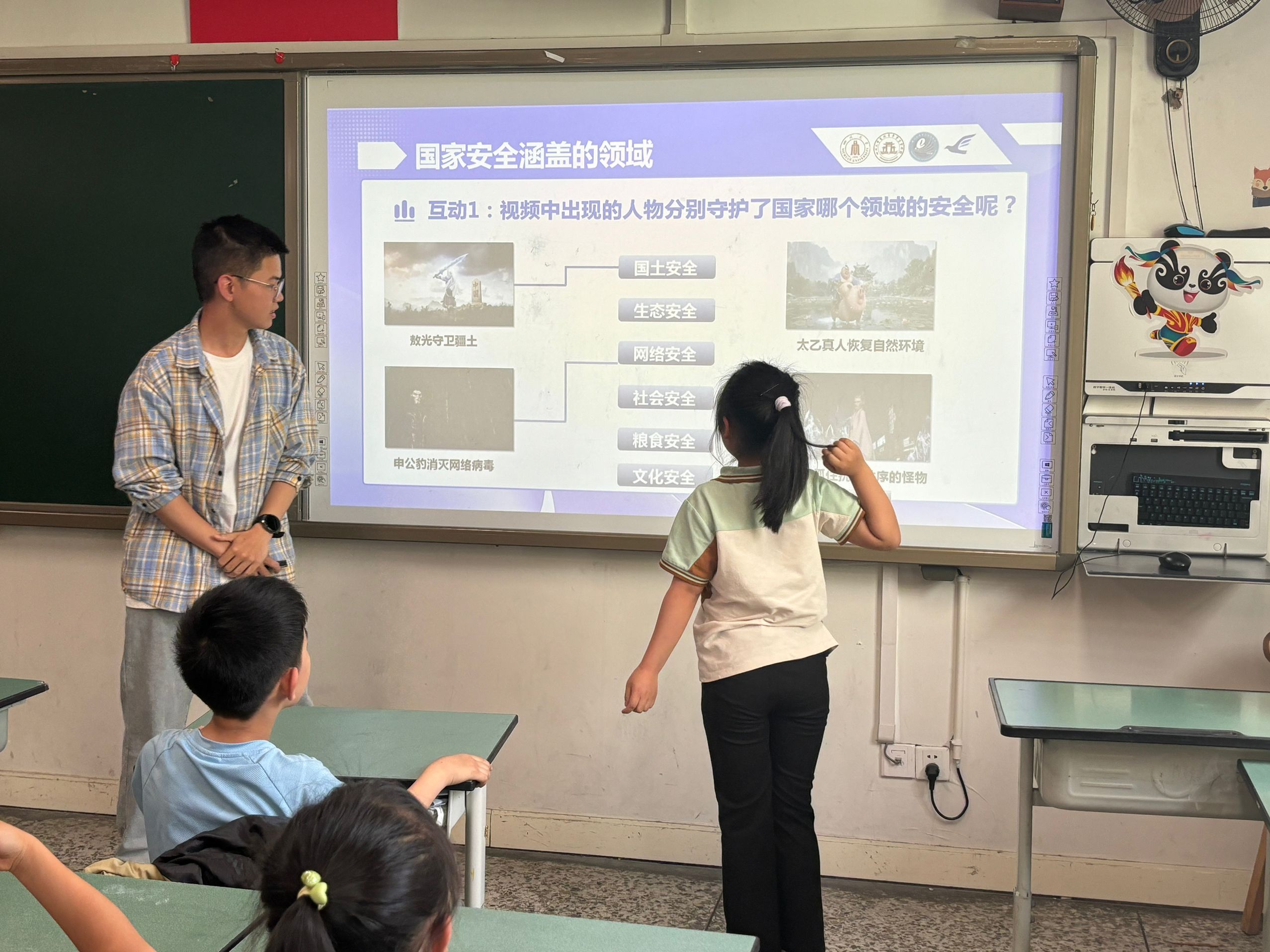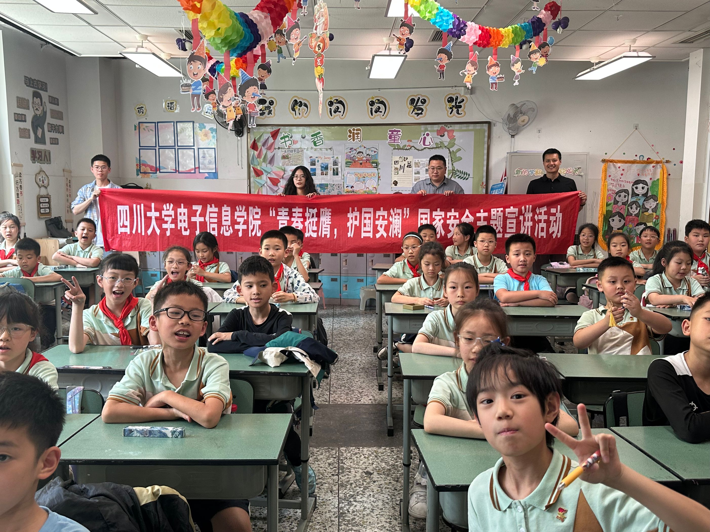 (国家保密学院)“电子之鹰”青年宣讲团走进成都市盐道街小学,举办“国家安全,保密先行”主题宣讲活动,为小学生们呈现了一堂生动有趣且富有教育意义的国家安全课程。院团委副书记、宣讲团指导老师申鑫,兼职辅导员杨婉丁,宣讲团团长莫斌斌、成员陈炳汕参加活动。