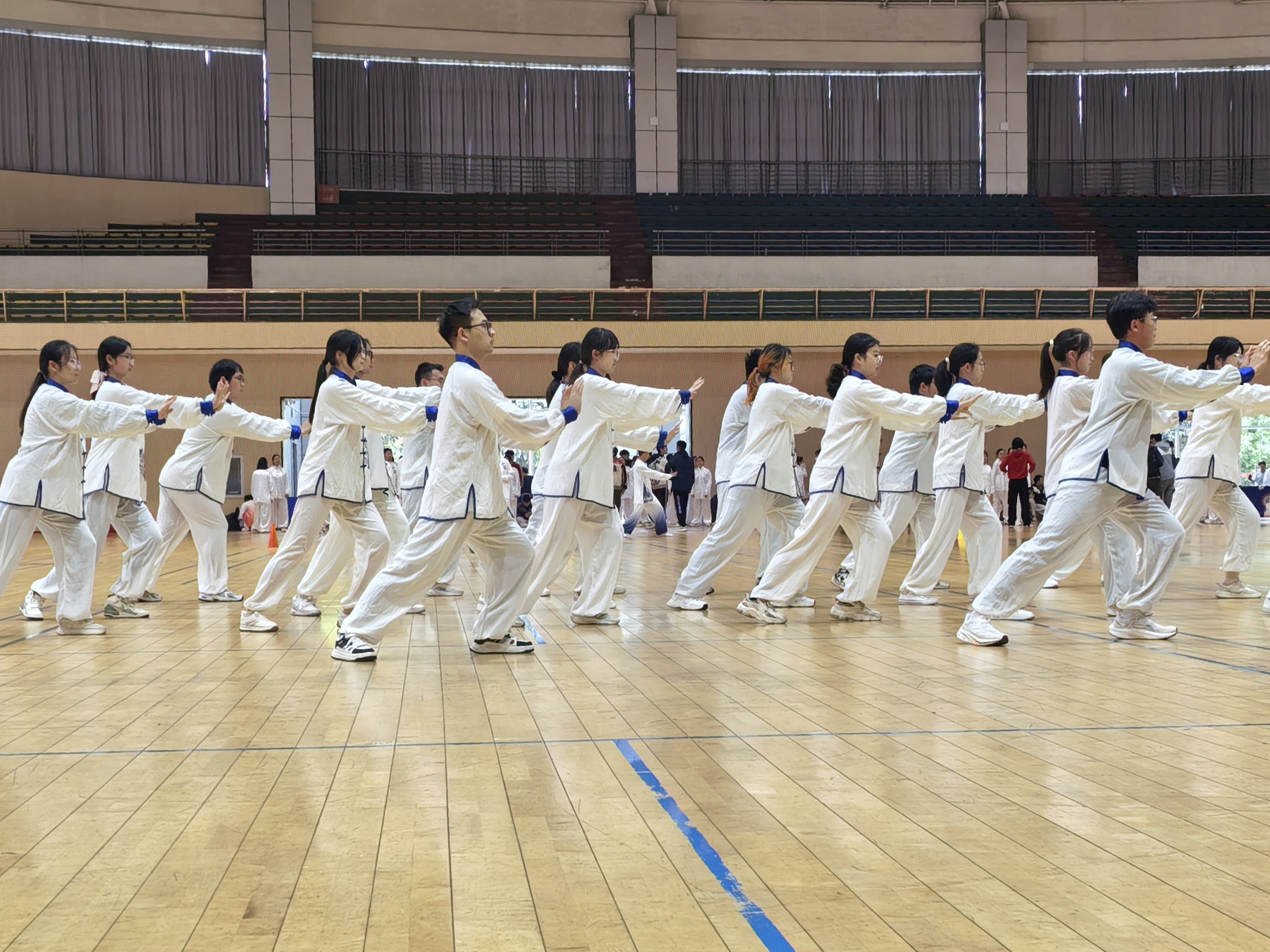 20名学子组成的太极代表队,身着统一服装,于赛场沉稳起势。他们的动作行云流水,在一招一式中,展现了电子信息学子沉着冷静的精神气质,为秋日赛场注入一股沉稳的力量。