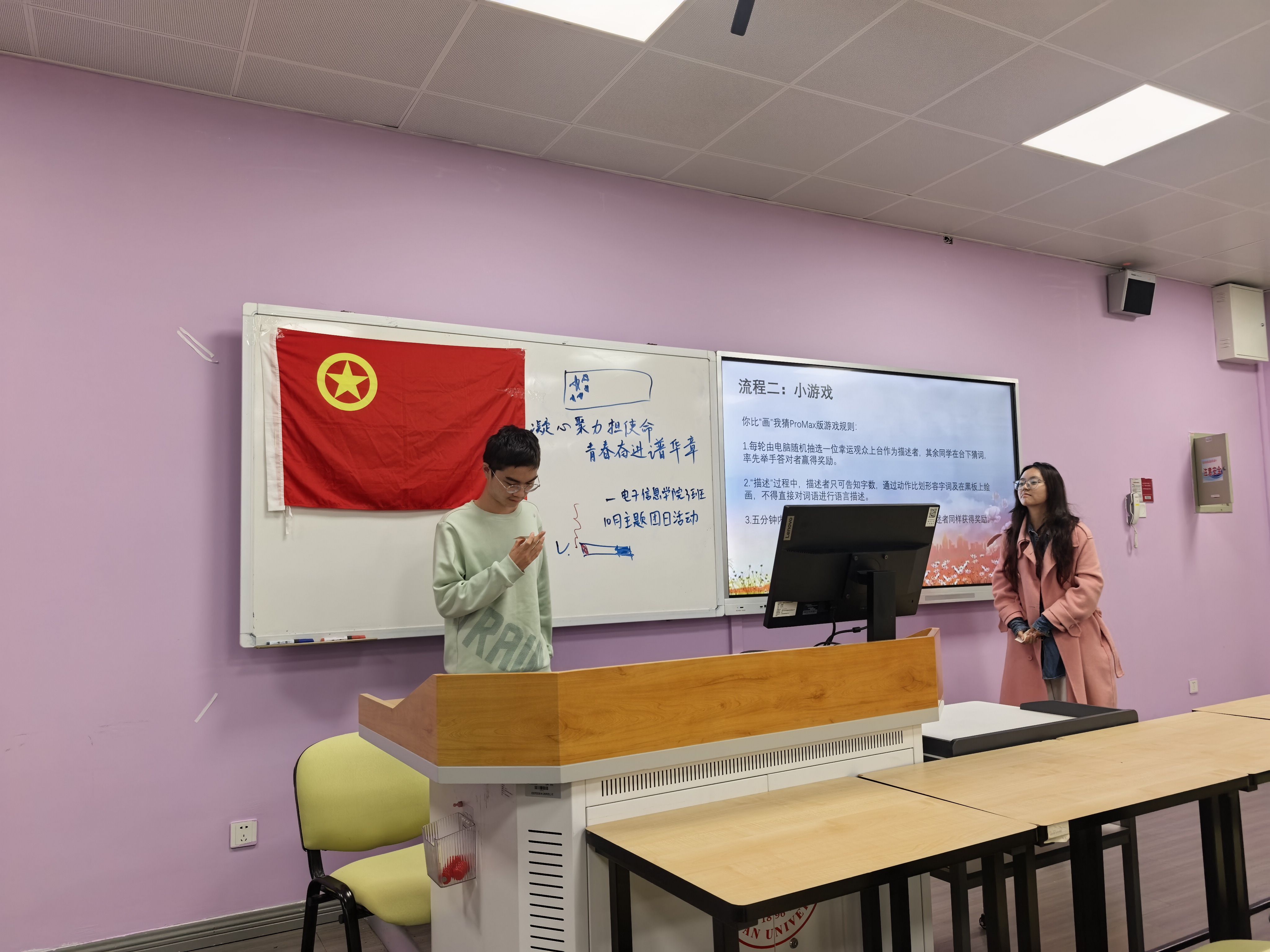 首先,现场开展“红色知识”你画我猜环节,团员们踊跃参与,不仅增强了同学们之间的默契,更领悟到伟大的抗战精神。