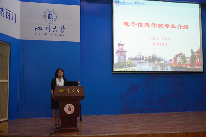 无线电电子学系的电子信息科学与技术、电子信息工程两个专业。她用生动幽默的话语详细介绍了这两个专业的特点和培养方向,强调电子信息专业是一门多学科交叉专业,需要同学们对各专业领域的基础知识都要有一定的了解,并且需要培养自己强烈的创新意识,广阔的国际视野,较好的综合素质和团队合作精神。闫丽萍教授还就学院学术资源和往届毕业生就业情况向2017级新生做了全面的介绍。最后,她祝愿台下同学能够处理好自己的大学生活,充实自己的能力。