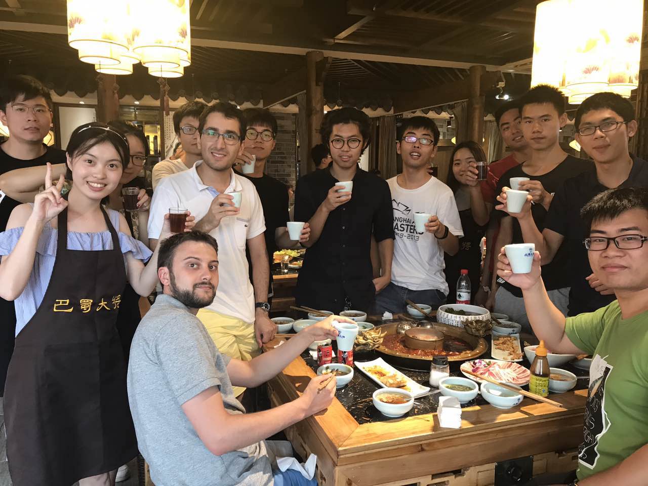 本次活动中,小组成员在春熙路的巴蜀大将火锅店举行了聚餐,同学们分成了两桌,大家坐的很分散有助于互相交流,在餐桌上四川同学很热心点了很多特色菜给法国同学与中科大同学,并一一对其进行了介绍,同时也与法国同学进行了餐桌文化的交流,最后大家都表示对于火锅的味道很满意,并学了中文“好吃谢谢”作为回应。在吃饭途中,火锅店准备了川剧表演,唱戏变脸一应俱全,让大家大呼过瘾,在欢声笑语中结束了本次聚餐。