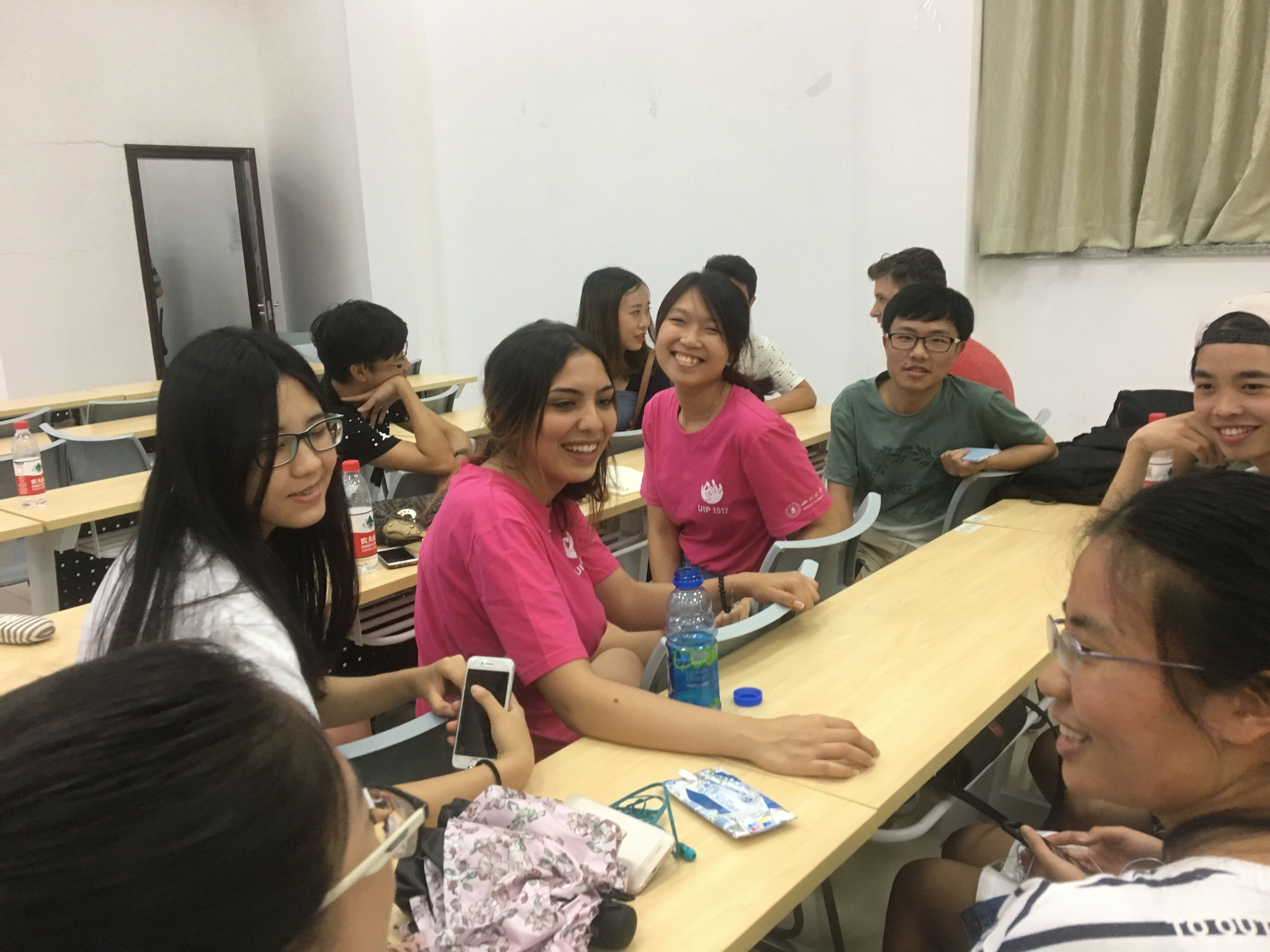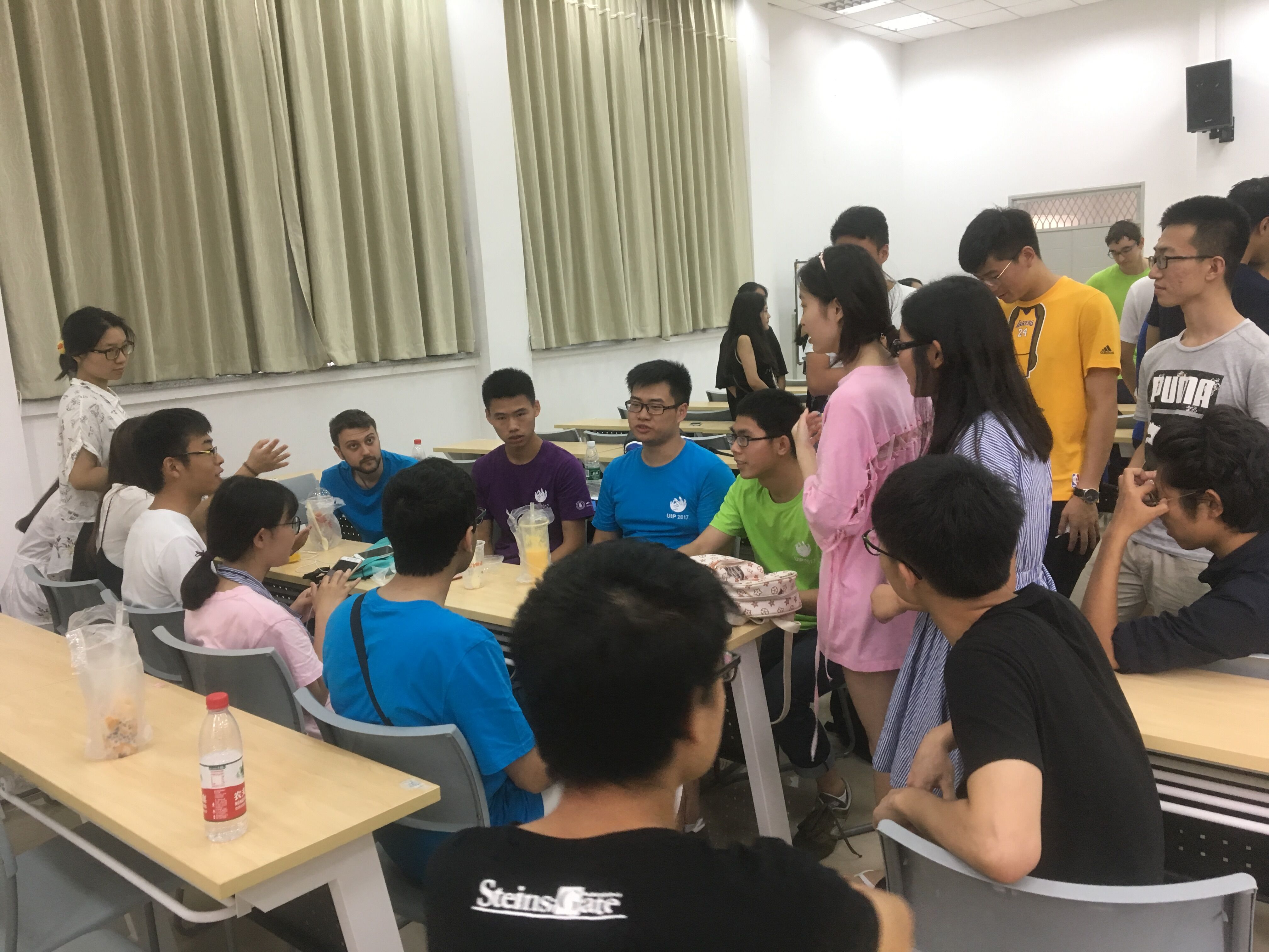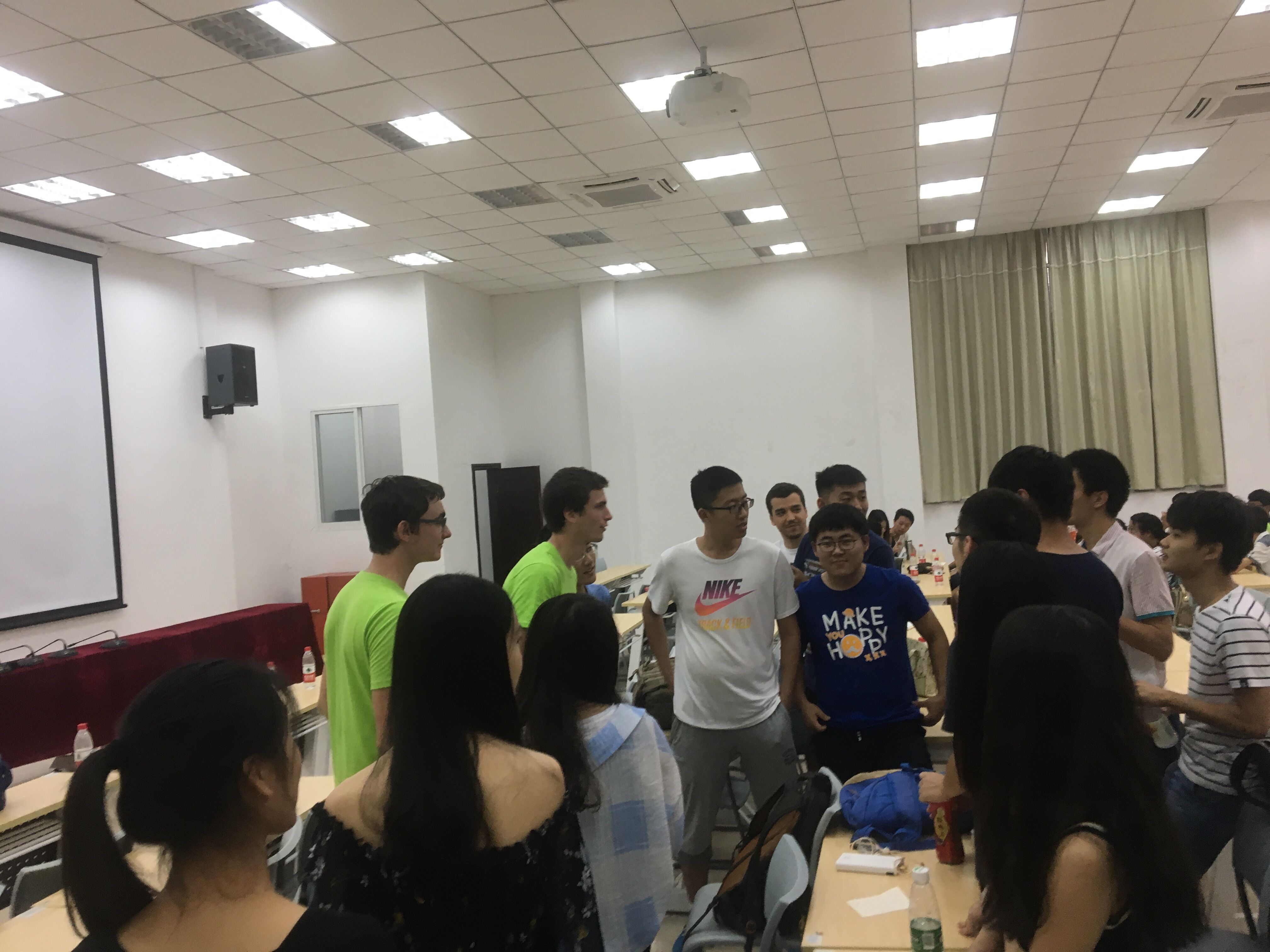 三个国际交流营小组组长主动地向中国科技大学和国外大学友人表示热烈欢迎。之后,组长带头进行自我介绍,每个组员都积极地向高校友人进行介绍并对他们表示了热烈欢迎,关心他们是否适应中国的气候和生活习惯,交流的气氛逐渐热烈起来。国际交流营小组的学生为外国同学描绘了中国文化和川蜀风情,外国友人对此表现出了浓厚的兴趣,主动提议在之后的两周交流时间里去体验成都这座城市的魅力。另外,交流小组和来自中国科技大学的七位同学热情地沟通,因为组员和参与的中科大学生专业相仿,因此对一些专业问题进行了深入地探讨,大大拉近了彼此间的关系。之后中科大的卢傲然同学主动上台表演,大家都兴致盎然,纷纷鼓掌示意。一场精彩绝伦的相声贯口,将现场气氛推向高潮,众人纷纷拍手叫好。之后国际交流小组的同学邀请高校校友参观川大校园,大家离开会场,MX动漫