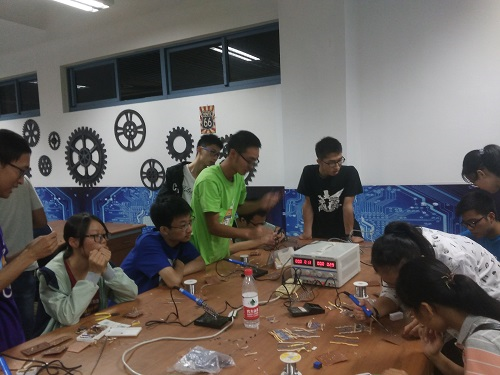 2016级1班的同学们有序地进入了科技园。首先,他们在第二基础实验楼A111室欣赏宣传部的作品展览。宣传部从立体海报、PS海报、手绘海报等几个方面对宣传部进行了精彩的展示,并鼓励同学们亲自动手彩绘。现场气氛融洽,同学们都兴致勃勃地拿起画笔、喷漆,切身体会着宣传部。随后在技术部人员的带领下,同学们进入A116室参观技术部的成果展示。技术部部长们依次介绍了飞思卡尔小车、船模型、光立方、摇摇棒、自制的脉搏血压测量仪以及一些科技园前辈们做的小游戏,赢得同学们的阵阵惊呼。之后在技术部部长们的细心指导下,同学们纷纷拿起电烙铁,体验动手的乐趣。参观完技术部的成果展示,同学们有序进入会议室A117室。行政部人员首先对同学们的到来表示由衷的欢迎,同学们也报以热烈的掌声。随后行政部人员根据自己的经验谈了谈加入科技园的益处,他们从学习技术、增强能力和拓展人脉三个方面阐述电子科技园的优势,条理清晰,有理有据,使人信服。行政部人员也罗列出与MX动漫