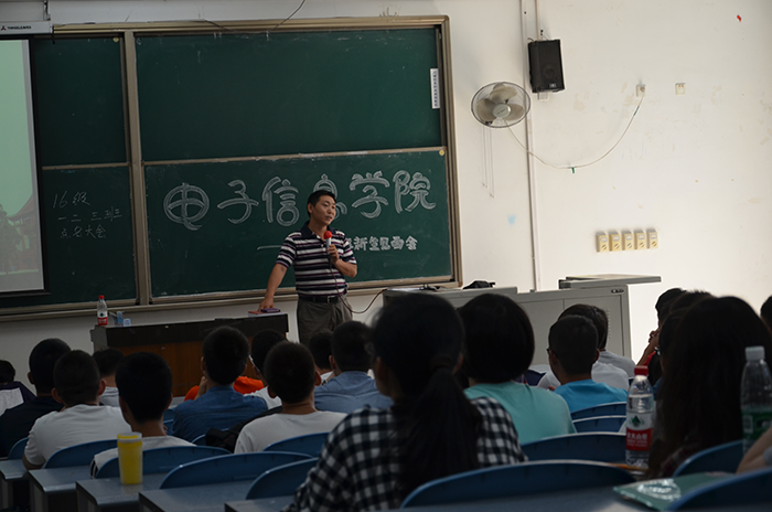 下午2点30分,新生见面会正式开始。首先,陈笃海副书记走上讲台,向在座的同学们问好,并详细地介绍了即将到来的大学生活,并希望同学们能把握大学时光,努力认真学习。随后,陈副书记依照顺序一个个地向同学们介绍了到场的老师们,这加深了同学们和老师们之间的相互了解,引起了同学们对老师的敬意,台下掌声雷动。接着,由李运国、陈林和陈晓娟三位老师分别在三个教室里用PPT幻灯片向同学们讲述了学院的近期安排和大学里的基本规矩,同时也提醒同学们注意在大学里的基本礼貌和安全问题。最后老师们还为每个班选出了临时负责人,这增强了班级的凝聚力,使同学们有了集体感,加深了对本班同学的了解。