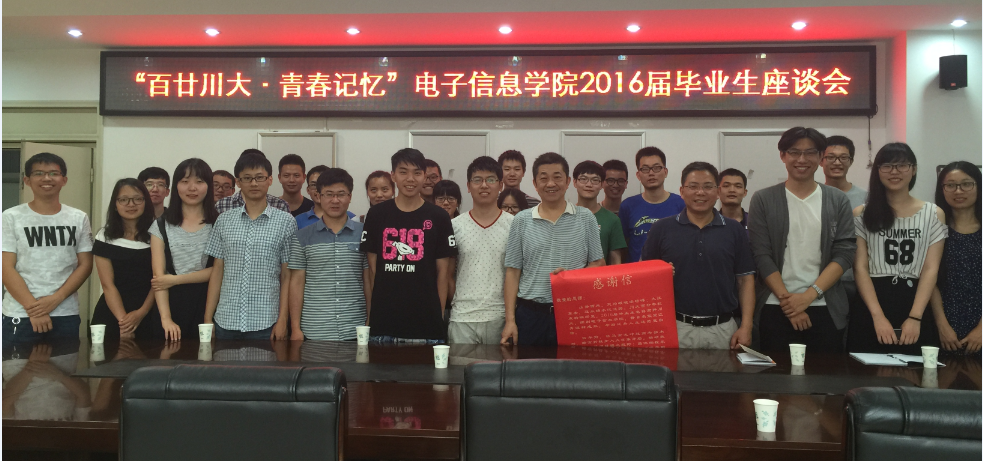 的保研加分政策需要进行一定的修正,应将比赛加分的比例略微下调,成绩加分比例上调,并重视论文及专利发明方面的加分。对于这个建议,周新志副院长指出对于本科生,发表论文和申请专利的难度相较于比赛而言更大,后者的可能性也较小。蒋斌书记则表示,现在学院的加分政策是综合考虑各方面利弊形成的。之后,2016届研究生毕业生王洪彬提出,应开设研究生就业指导课程,培养研究生的面试技巧。陈晓娟老师对该建议给予了认同,并表示学院会进行考虑及相应改进。最后,优秀毕业生代表郭力达同学声情并茂地朗诵了一篇毕业生写给老师及学院的感谢信,全体与会毕业生及老师进行了合照。